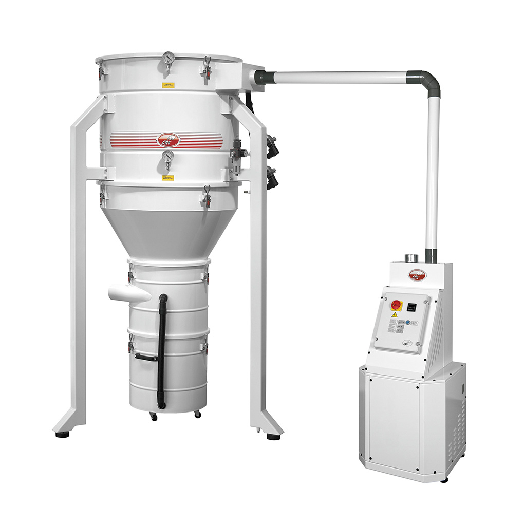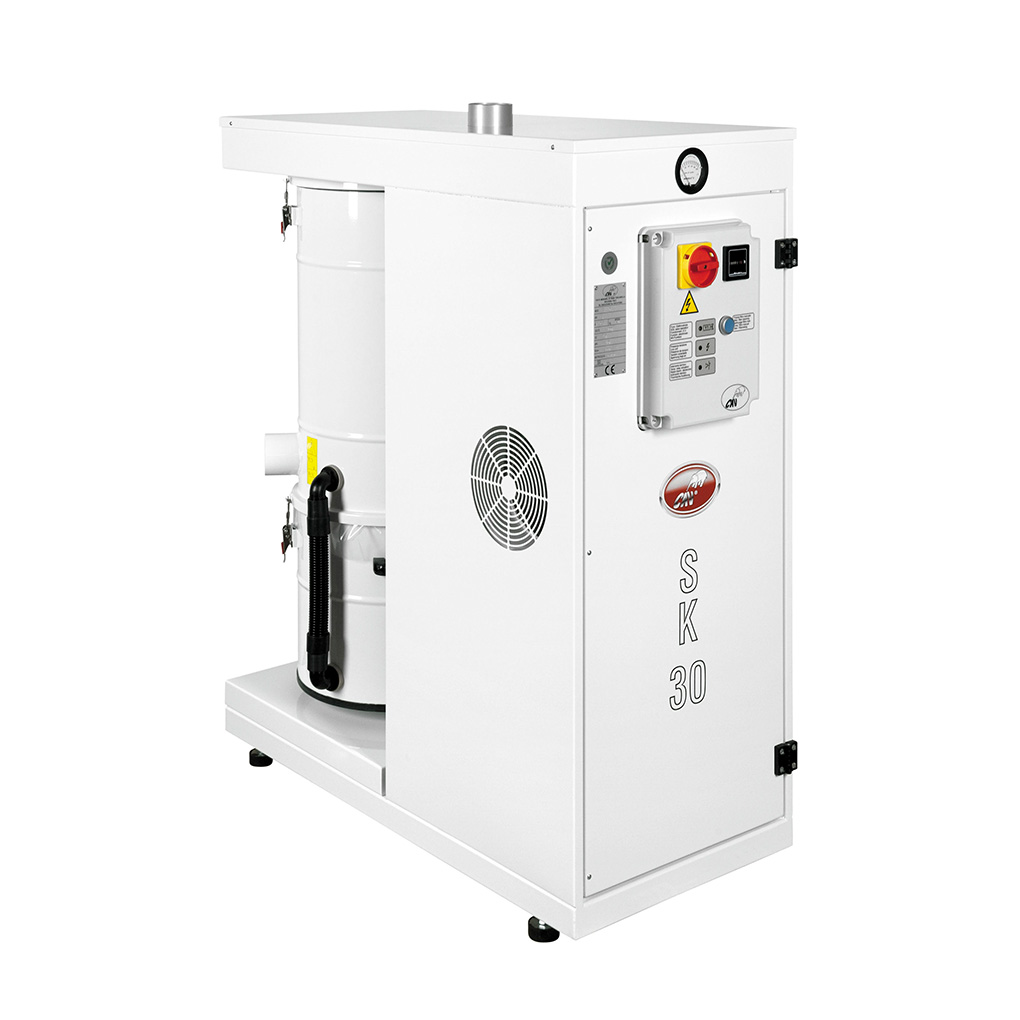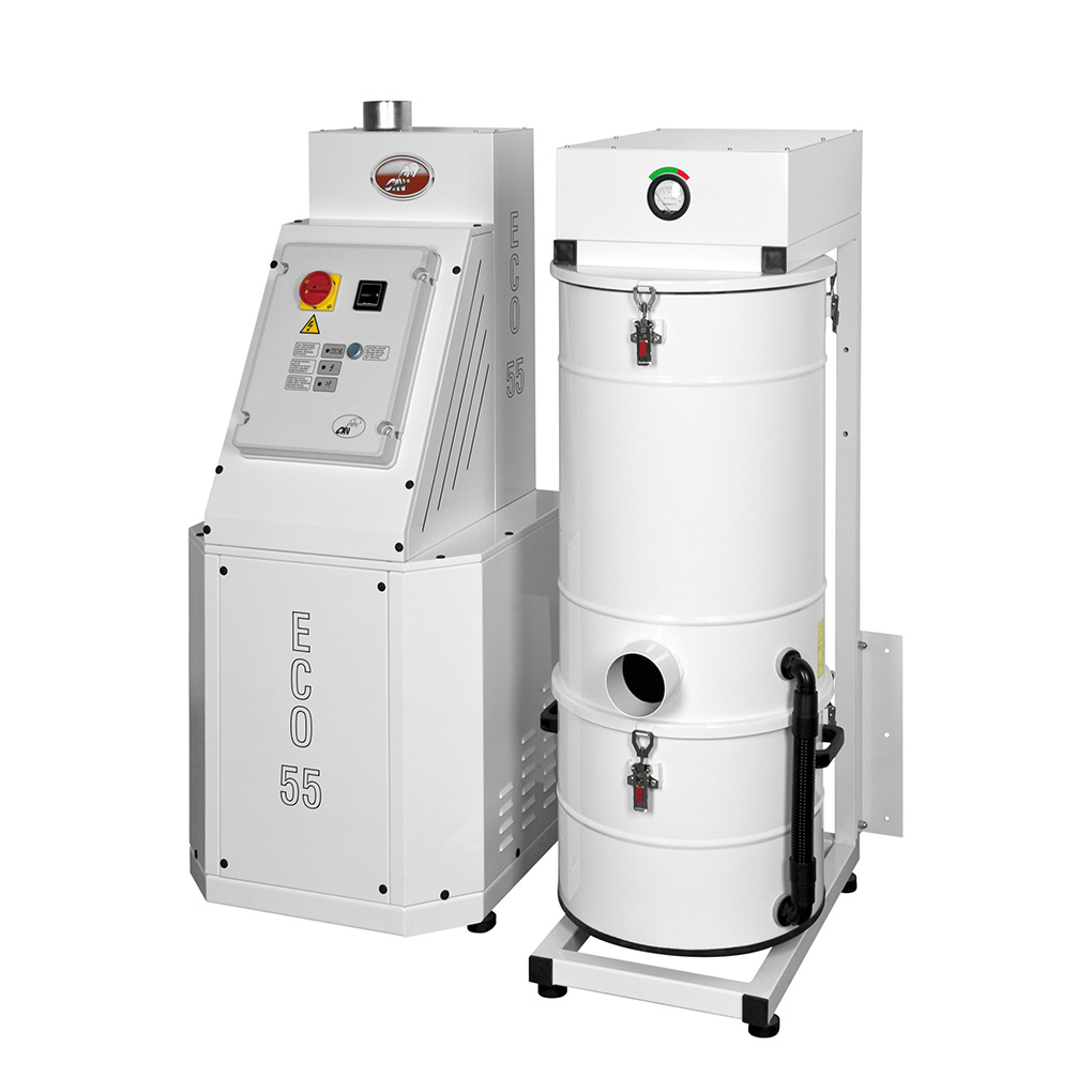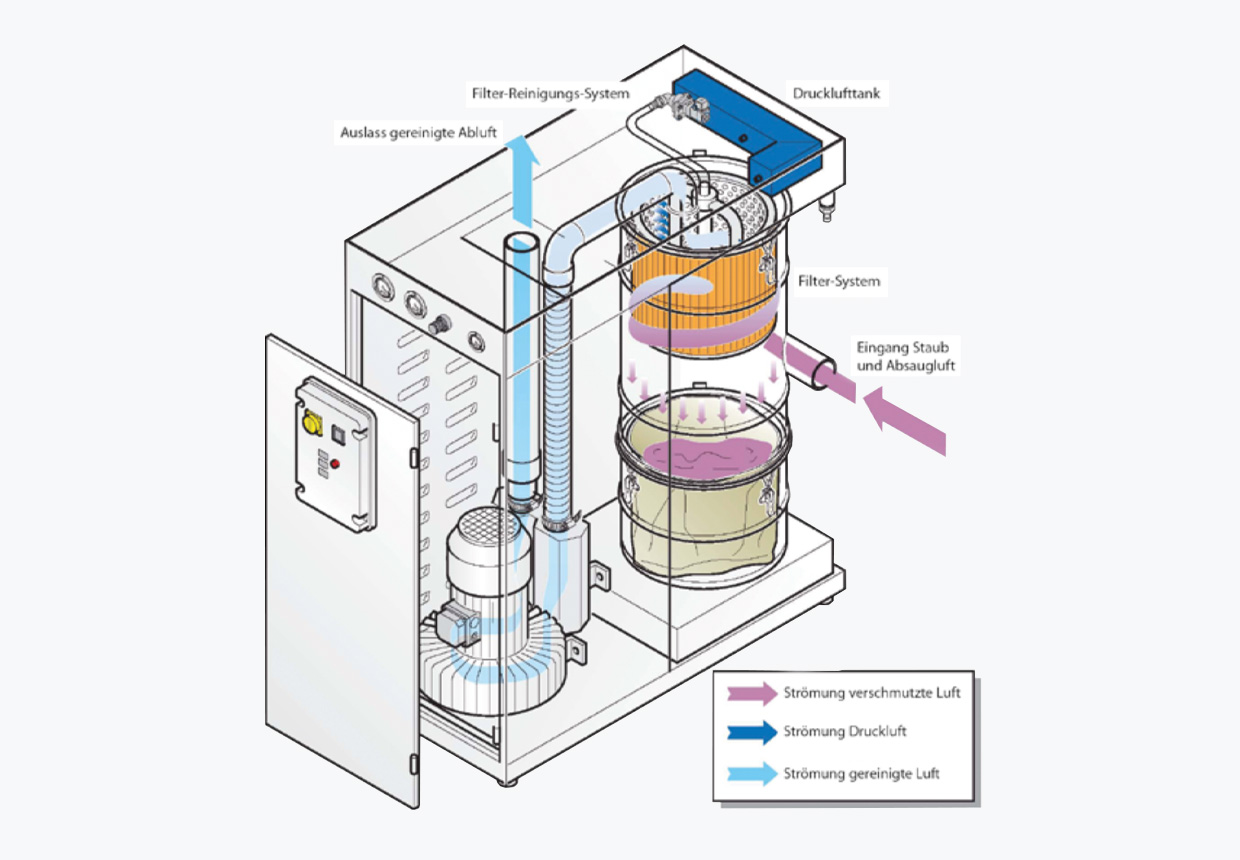 Absaugturbinen in Seitenkanal-Technologie sind das Herzstück für eine zentrale Absauganlage von Schleifstaub, der beim Bearbeiten von Oberflächen durch Schleifwerkzeuge entsteht. Der Staub wird in einem Behälter mit eingelegtem Nylonbeutel gesammelt. Dadurch wird eine staubarme Entsorgung des Staubs gewährleistet. Das Abscheiden des Staubs erfolgt über einen Zyklonabscheider mit eingebauter Hochleistungs-Filterpatrone, die automatisch über einen Druckluftreinigungseinheit permanent gereinigt wird und dadurch eine sehr hohe Lebensdauer garantiert wird.